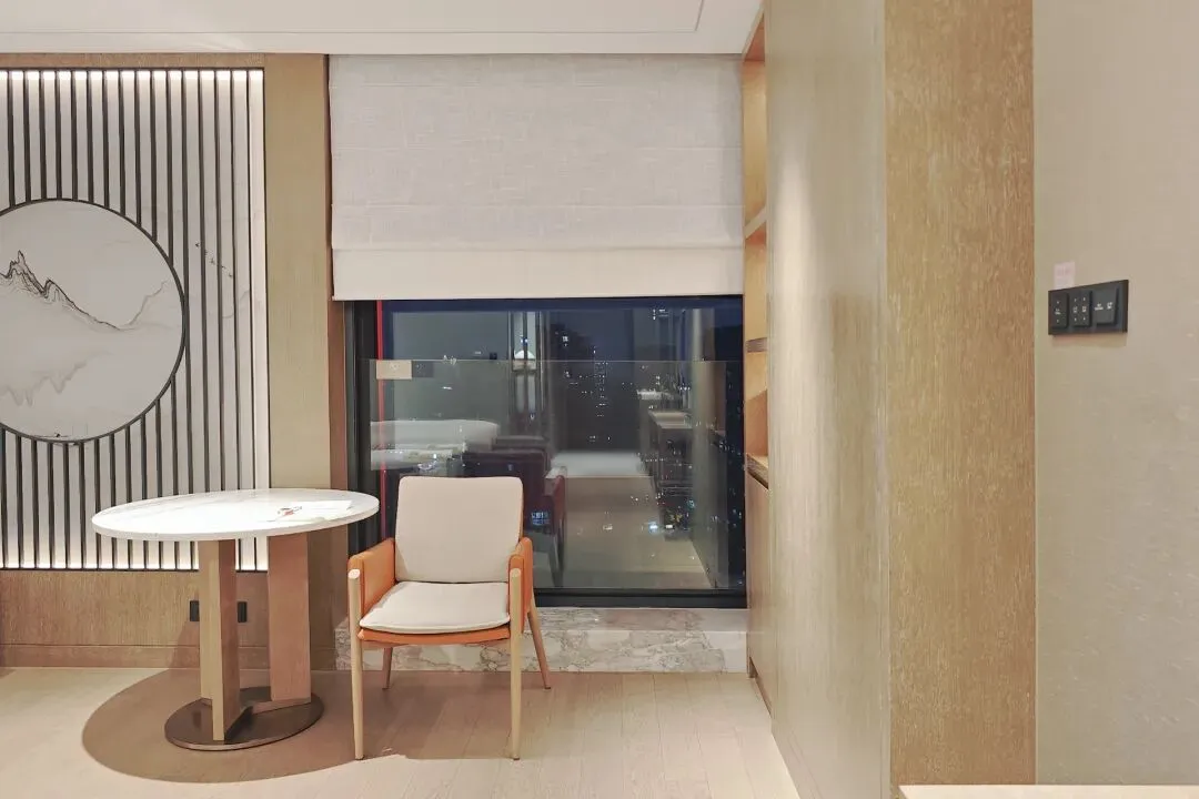 房间窗帘和窗户都采用电动操控,大落地玻璃设计使得高层视野直接拉满,站在全景落地窗边就能看到钱江新城的城市景色,傍晚看着窗外的车水马龙,饮杯热茶聊聊天,旅途的疲惫瞬间就消散了。