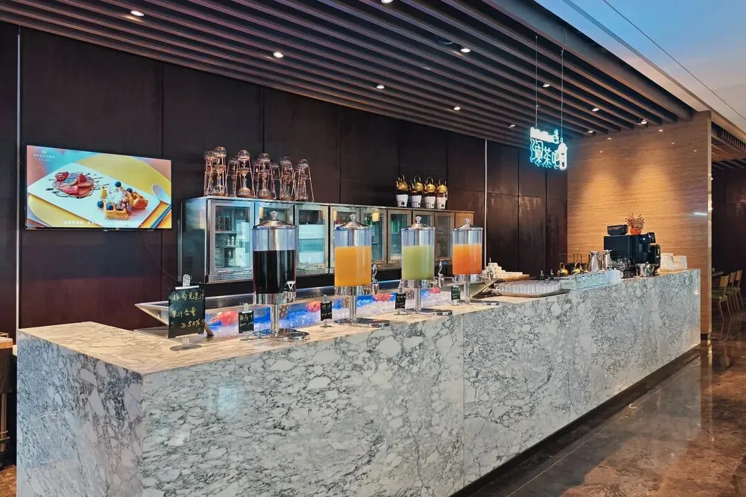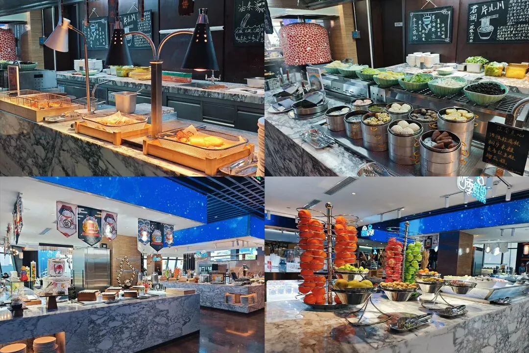 早餐的品类超丰富,中式的有粥、包子、馒头、烧麦、油条、豆浆等等,还有各种现煮的面条和馄饨,浇头可以自己选,葱花、香菜、榨菜、肉末应有尽有;西式的有面包、蛋糕、三明治、煎蛋、培根、牛奶、果汁,还有各种新鲜的水果和酸奶。最难得的是,所有餐点的口味都特别适中,不会像一些自助餐那样重口调味,娃爱吃西点和小包子、水果,老人能吃的清淡粥品、蒸点,都能找到。前两个月网上看到它还提供早餐盲盒,只需20元,在9:45–10:00可以前往取盒自行打包,有住在附近的小伙伴可以去问问看。