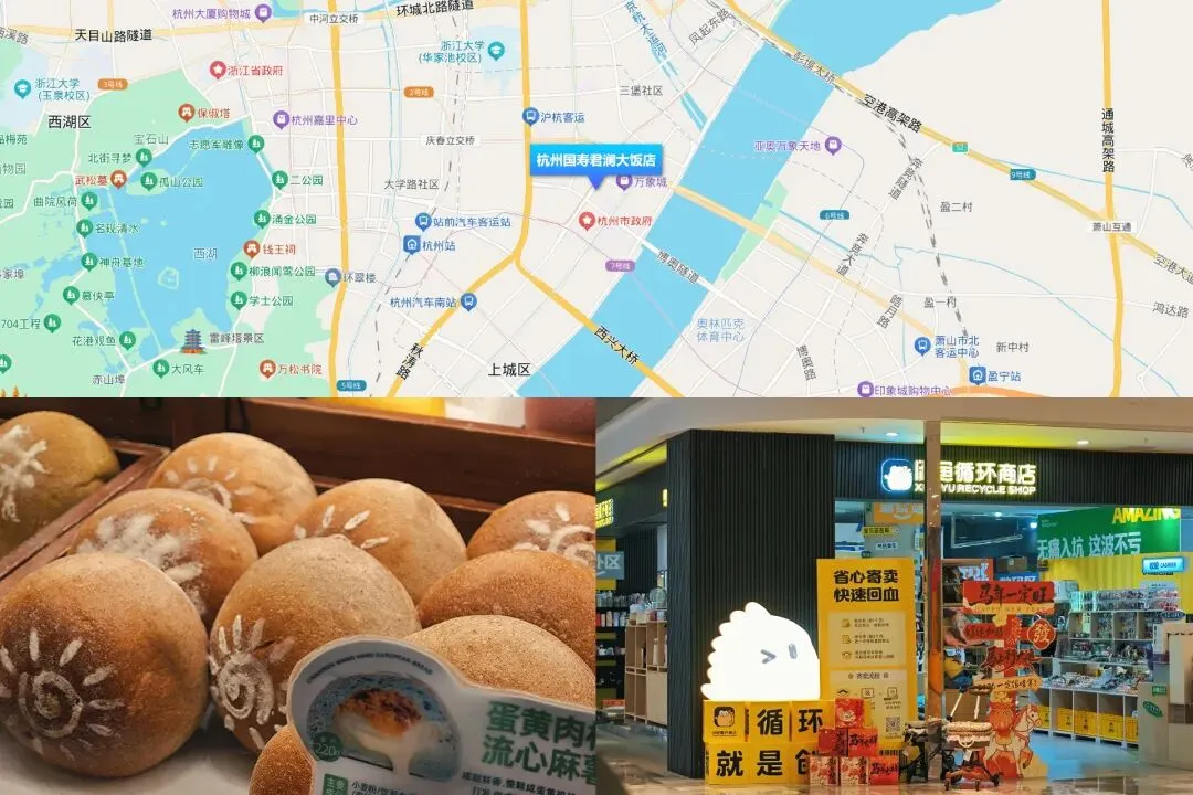 酒店周边的配套也堪称完美,出门就是地铁口,去西湖、杭州东站、动物园都很方便,附近的地铁4号线江锦路站上车20多分钟就可以直达杭州东站,距离机场也才不到30分钟的车程。酒店附近就是来福士和万象城等商圈,不足几百米,步行几分钟就能到,晚上休息前可以直接溜达过去。我们去逛了来福士,美食小吃都有,主要是顺手去打卡当地超火的面包房(枣叔的店),也逛到了罕见的闲鱼线下店,在酒店附近,逛吃逛玩一站式搞定。如果晚上充沛,也可以去1公里外的城市阳台看灯光秀。