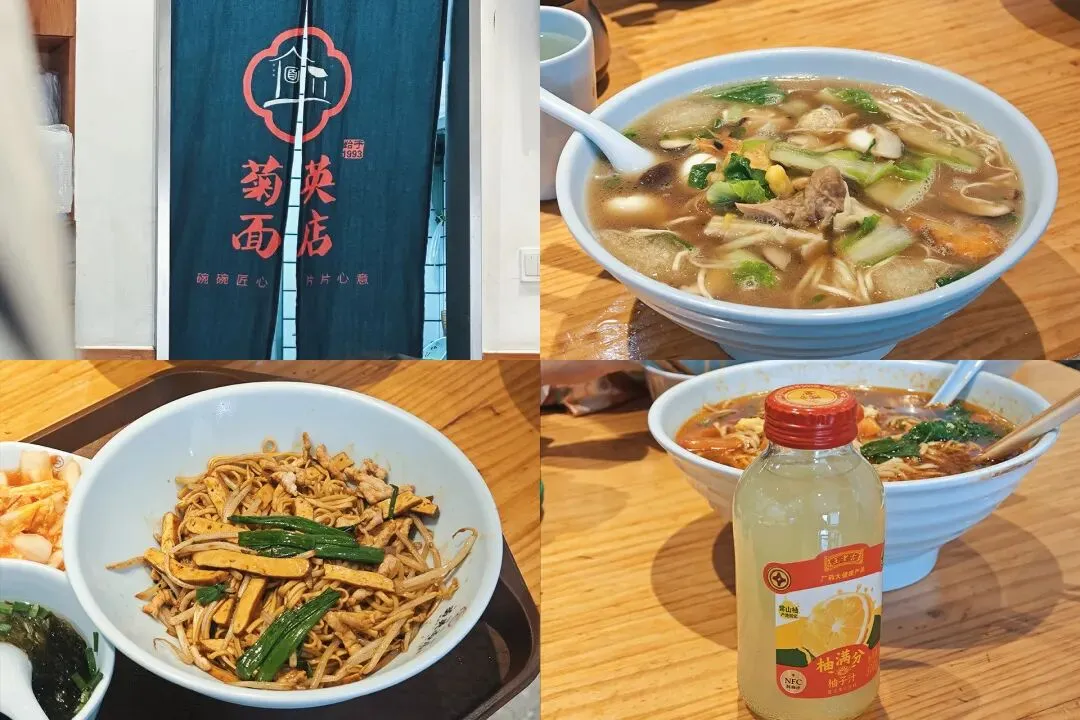 晚饭选择了当地人认可度高的菊英面馆(延安路店),主打地道的杭州味道。一家三口点了番茄鸡蛋面、肉丝拌川套餐(带凉菜和柚子汁)、三鲜面,每一碗面都分量十足,味道超赞,番茄鸡蛋面的汤汁酸甜浓郁,娃超爱吃。肉丝拌川劲道入味,三鲜面的配料扎实,有虾、肉丸、鸡肉、香菇等,鲜美地道,一家三口吃得满足又饱腹,价格也很亲民,人均 20 左右,团券更低。