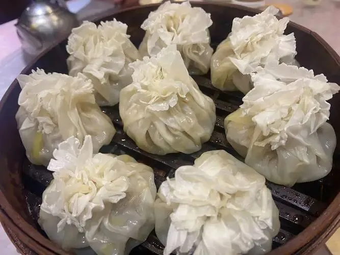 烧麦个头饱满,皮薄汁多,蒸笼一开全是热气。