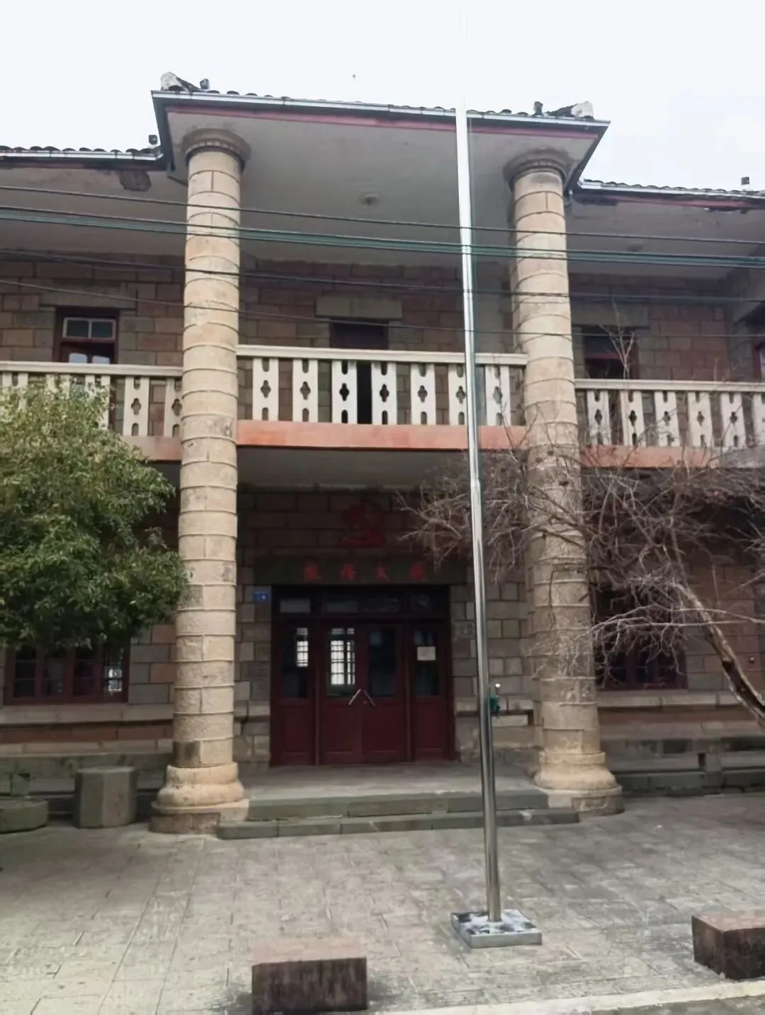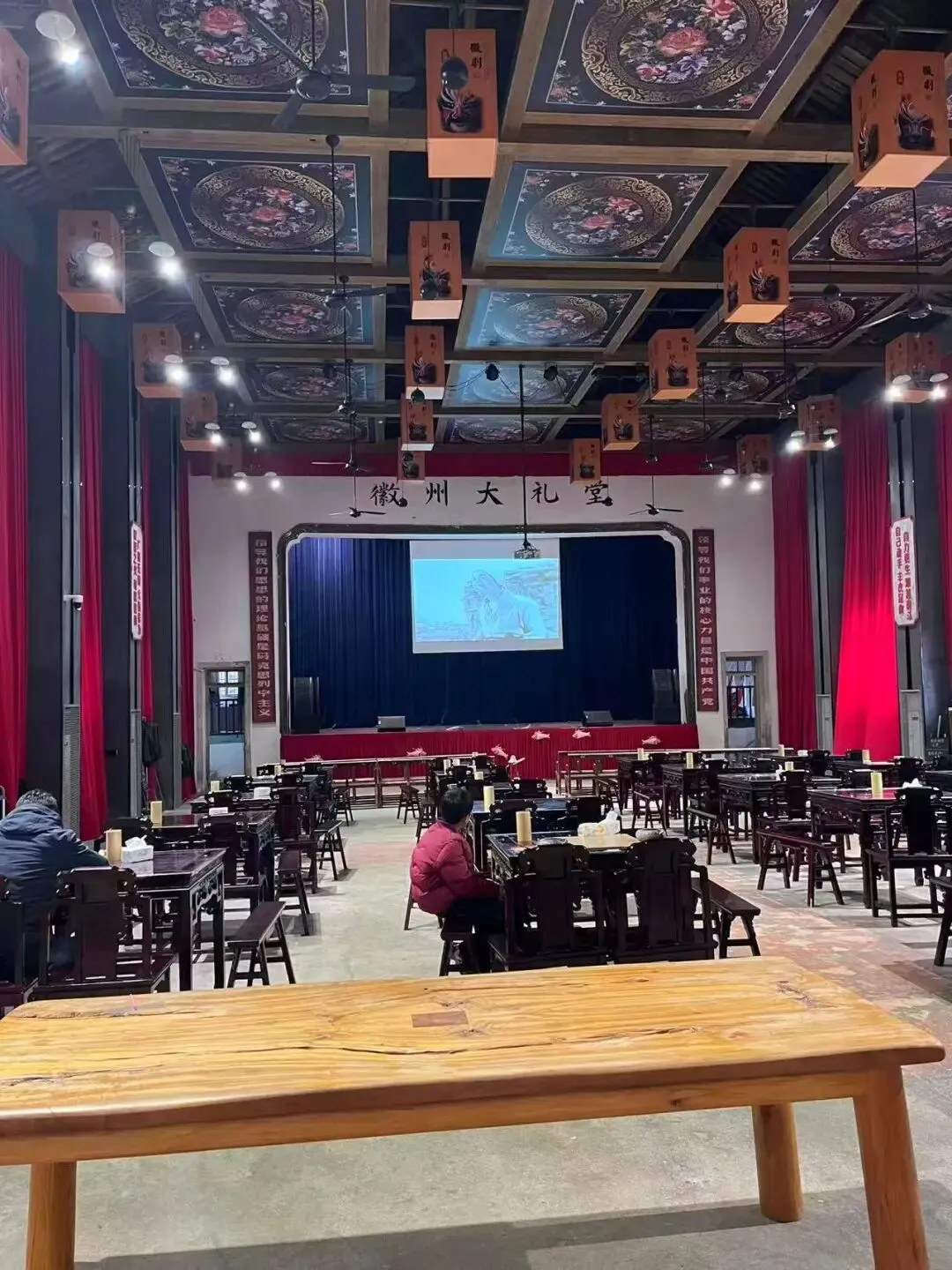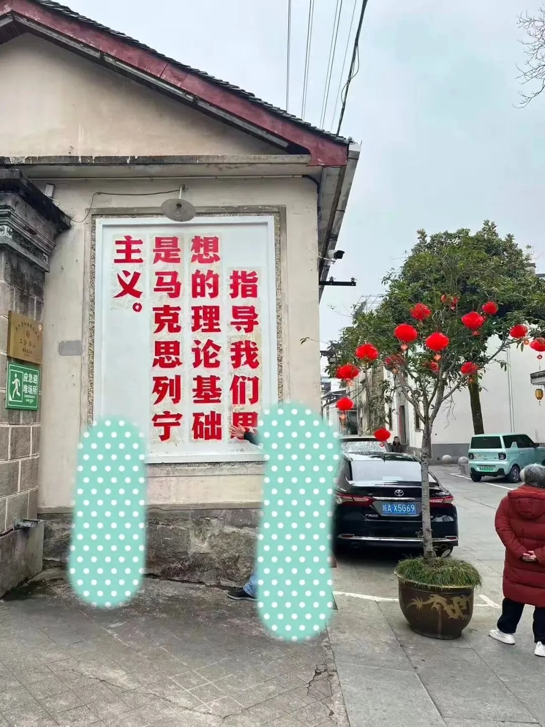 二、老县委礼堂 从供销社旧址出来,往后走没多远,就到了老县委礼堂改建的徽州大礼堂。这座建筑现在是歙县芳华酒店(徽州古城店)的一部分,但和酒店客房并不相连,非住宿客人也能进入。虽然它的核心功能发生了变化,但整体外貌还是保持原来的风格,下图为门口的标语。酒店的名字也符合那个年代,让人想起那部去年在网上引起轩然大波的同名电影来,当然,酒店开业的时候,围绕电影的二创还没有这样的热度。