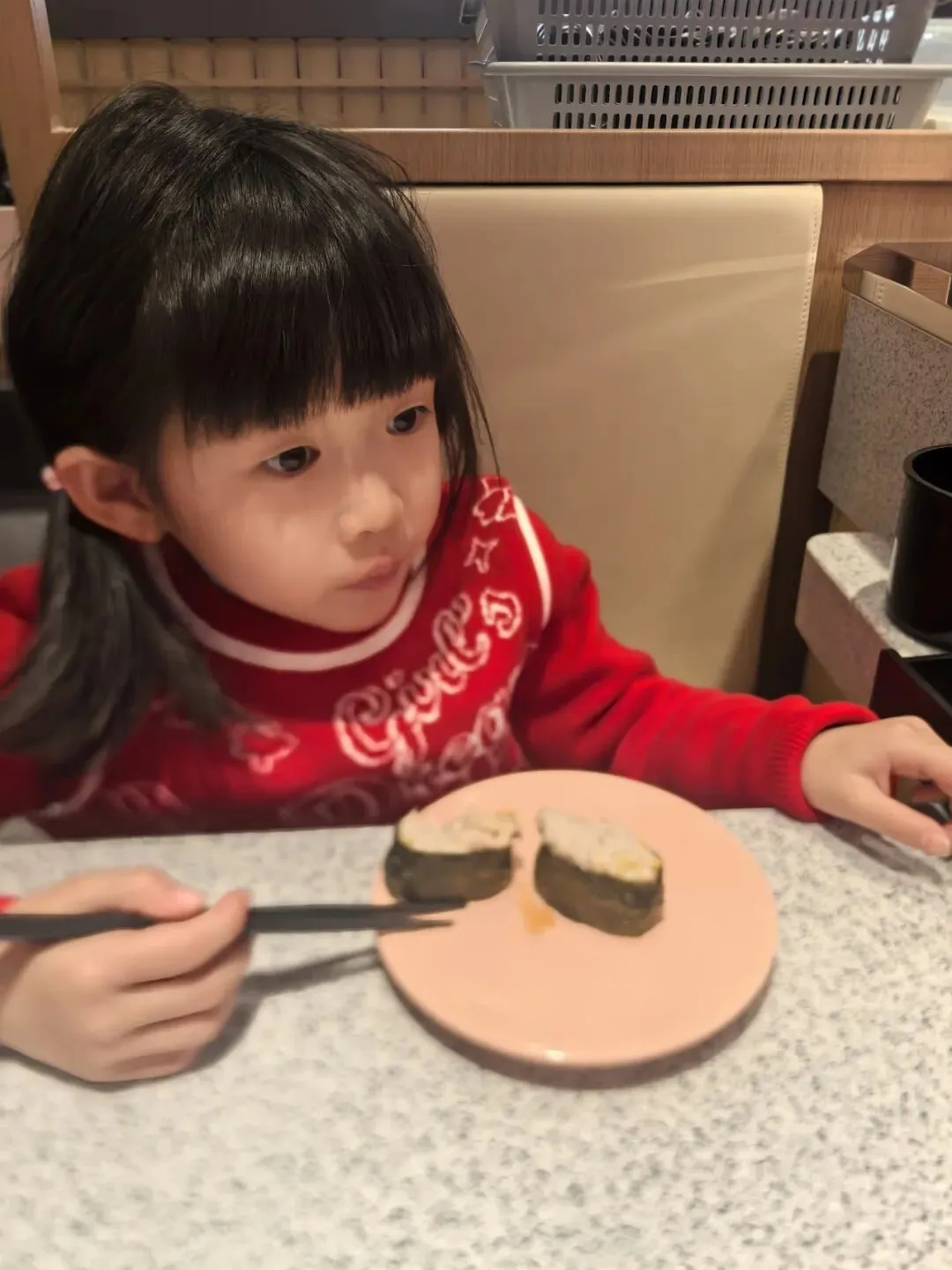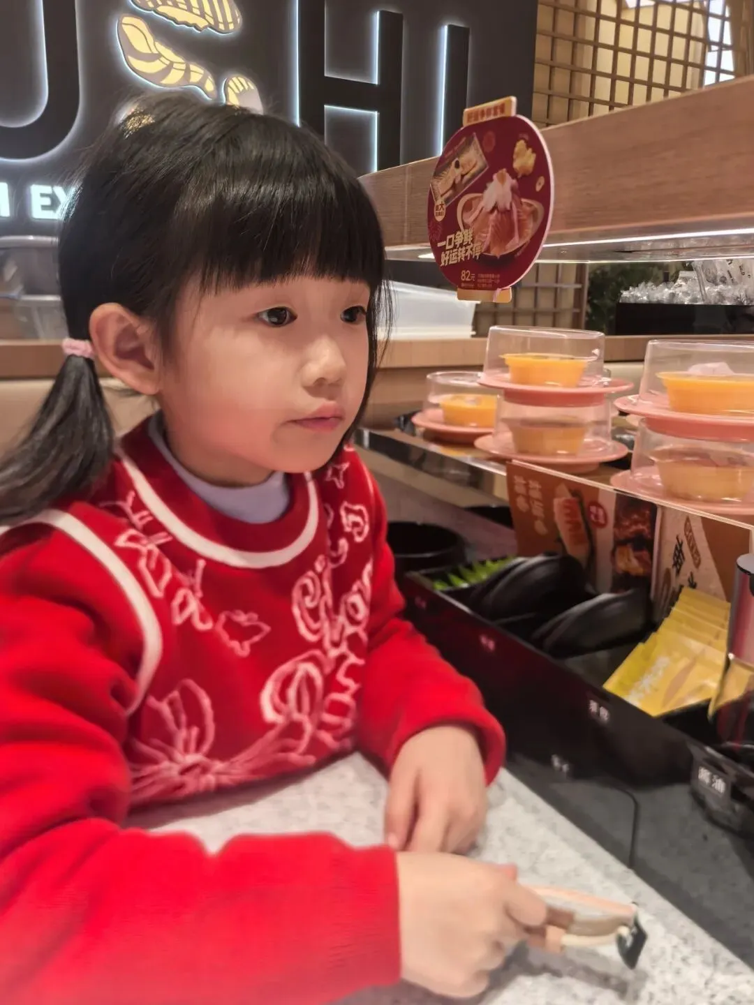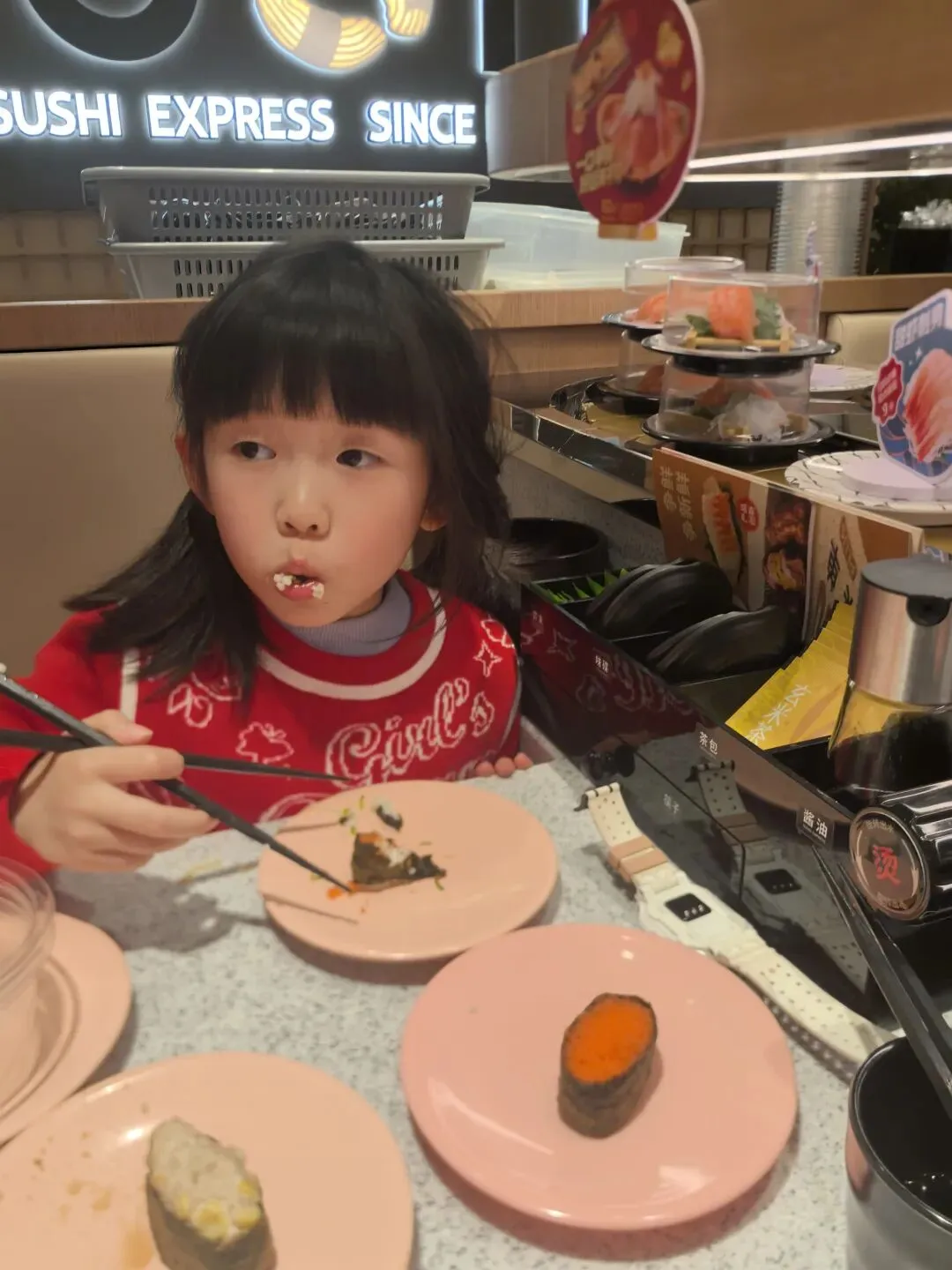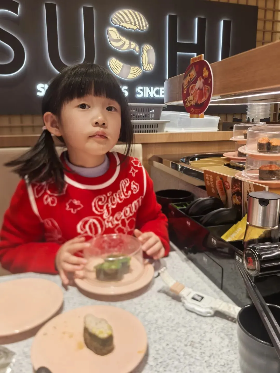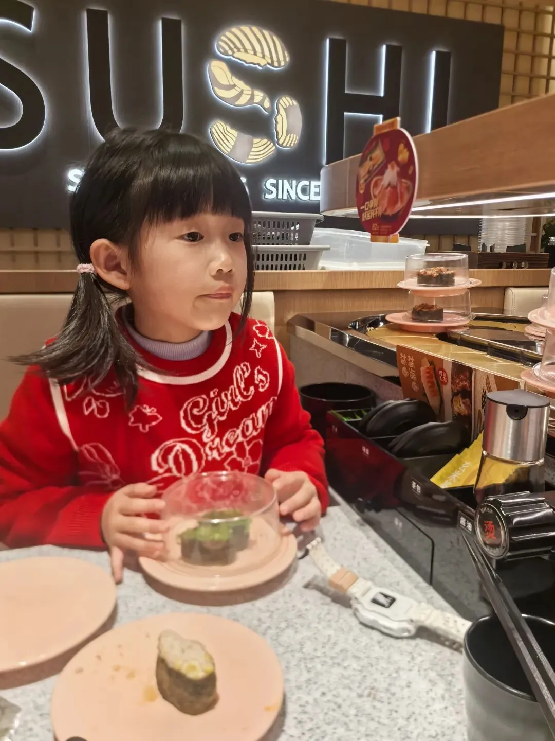 我们在商场里正好看到一家我喜欢的旋转寿司。