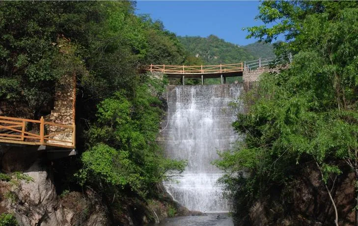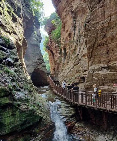 这条谷里的水不是死水,是活水,从山上一路流下来,水质清到能看见石头上的纹路,夏天光脚踩进去,水凉得刺骨,但那种凉不是冰冷,是一种能让你瞬间清醒的凉。谷里的植被密度高,走在栈道上,两边全是郁郁葱葱的树,阳光透过树叶打下来,形成斑驳的光影,空气里湿度很大,带着植物的气味,这种环境在中原地区真的不多见。