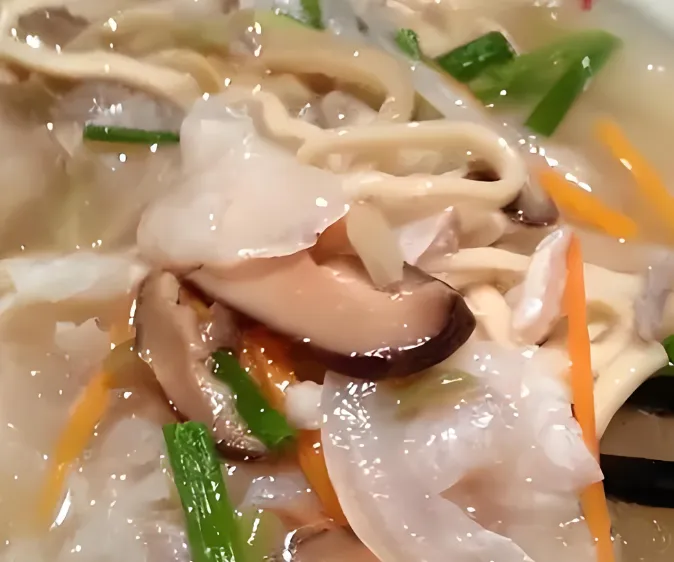 第二美食:三丝敲鱼这是温州人的“匠心艺术”。把鱼肉裹淀粉捶成薄饼,切条后配火腿、香菇、鸡丝煮汤。鱼片滑嫩又有嚼劲,汤头鲜美得掉眉毛。这可是非遗技艺,去老正兴菜馆能吃到最正宗的,别去景区吃,容易踩雷。