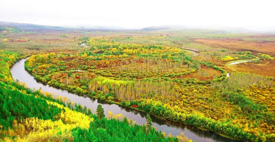 九曲十八弯是漠河的一片湿地,夏天来看是一种美,冬天来看又是另一种美,夏天的时候,河道蜿蜒曲折,绿草茵茵,站在观景台上往下看,那条河就像一条白色的带子,在绿色的草甸上绕来绕去,你会觉得大自然怎么能把线条画得这么流畅。