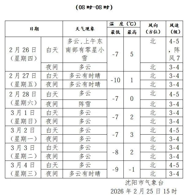 沈阳未来七天天气预报