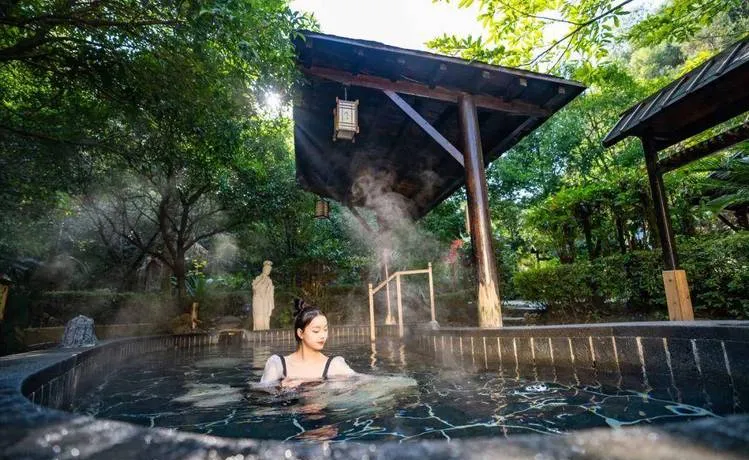 明月山的温泉和别的地方的温泉不一样,不一样的地方在于它是天然含硒的,硒这个元素很多人不熟悉,但你真泡进去就能感觉到区别,别的温泉泡完会觉得皮肤滑滑的,有点假假的那种滑,温汤镇的温泉泡完是一种很自然的舒服,就是那种你不会特意去想"我的皮肤变好了",而是整个人状态变松弛了。