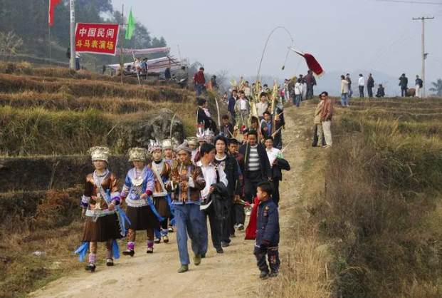 活动当天早上指定时间在指定地点集合,准时出发。坐车前往融水香粉乡古龙坡。古龙十六坡是融水地区最盛大的传统节日之一,定于每年正月十六和八月十六,在香粉乡古龙坡举行。每当节日来临,这里就会汇聚大量身着节日盛装的男女青年,他们吹着芦笙,热情参与各种活动,如烧香鸣炮、舞龙舞狮、斗马、斗鸟等,其中以斗马最为引人注目。此外,坡会也是人们团聚交流、年轻恋人表达爱意的时刻。姑娘们身着绚丽的民族服装,在芦笙声中跳起舞蹈,场面生动活泼。吸引了众多游客参与,让更多人了解苗族文化的魅力,展示了苗族人对生活的热爱和对传统文化的传承。