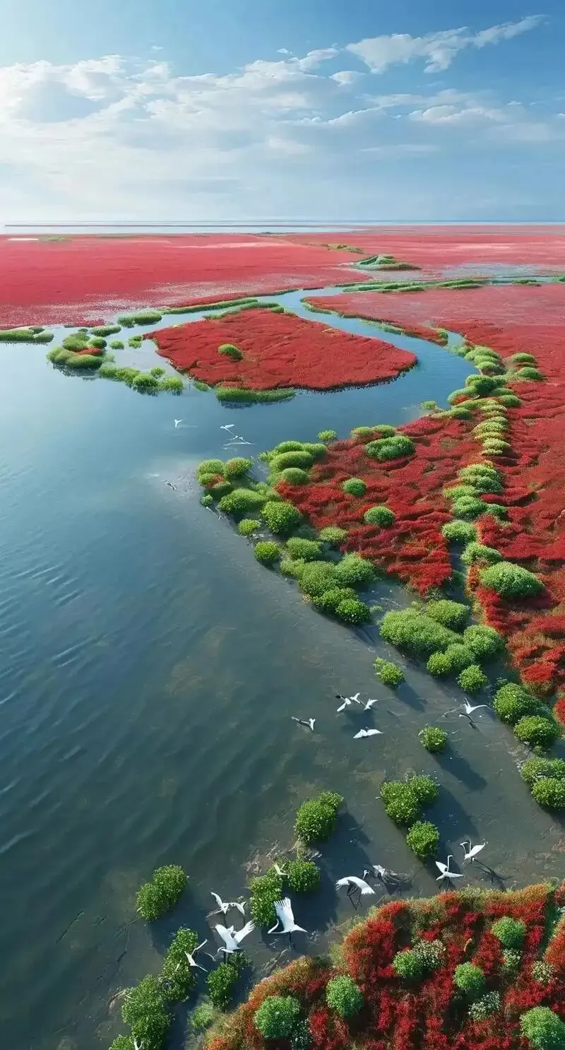 红海滩位于辽宁省盘锦市,是国家5A级景区,被誉为“世界红色海岸线” 。这片奇观并非真正的沙滩,而是由一株株纤弱的碱蓬草织就的红色海洋 。