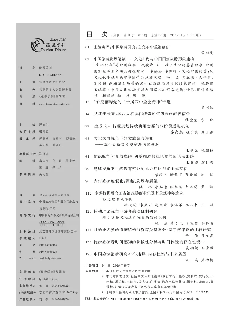 您现在的位置是:首页 > 国内旅游目的推荐 > 正文 国内旅游目的推荐 《旅游学刊》2026年第2期目录 admin2026年02月26日 07:35:39国内旅游目的推荐11 《旅游学刊》2026年第2期目录 转载请说明来源于"旅荐网",部分内容转载自网络,如有侵权请联系qlwl@foxmail.com删除 本文地址:https://www.15386.cn/post/124016.html 上一篇 【深圳招聘】央企上班!超多岗位,中国旅游集团所属企业岗位公开招聘~ 下一篇 旅游攻略 | 别只去外滩了!虹口才是老上海的“灵魂”:这些老街藏着最地道的魔都记忆 相关文章 犍为世界茉莉博览园|万亩茉莉秘境 全域旅游攻略 出片友好旅行|西昌打卡攻略分享建议收藏 跟着外国人游中国:当“他者视角”成为最潮旅行指南——旅行攻略 曲江上巳节周末游玩全攻略:从打卡点到动线都安排好了 各位吴彦祖刘亦菲们!看海旅游攻略推荐 夯爆了!西安旅游热门景点预约指南 2026旺季版 J人手写版西安旅游攻略不看千万别来| 救命!我的旅游规划翻车实录 长沙旅游及行李寄存攻略 码住!明月山周末2天1晚游玩攻略来喽,跟着走就对啦~ 发表评论 取消回复 评论列表 这篇文章还没有收到评论,赶紧来抢沙发吧~