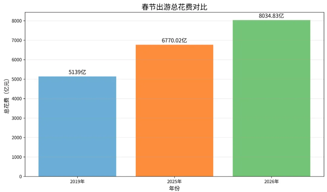 日均总花费:2026年(892.8亿元)较2025年(846.3亿元)增长5.5%,较2019年(734.1亿元)大幅增长21.6%,显示出假期延长对消费总额的显著拉动效应。