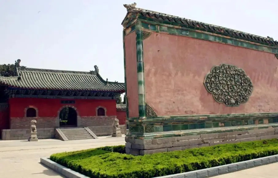 进入比干庙,首先映入眼帘的是明代照壁,上面“丹心千古”四字苍劲有力。照壁高约6米、宽度约10米,照壁上有24块绿色的琉璃砖雕牡丹图,寓意着林氏子嗣昌盛。这些琉璃砖雕构图精巧,色彩绚丽,牡丹花枝繁叶茂,根部落入其下的花瓶,寓意叶落归根,故有“卫辉比干庙,天下林氏根”的说法。