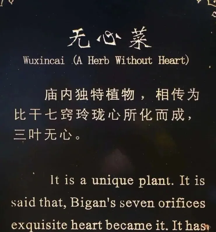 庙内也有一块种植没心菜的田地,奇怪的是没心菜是每一年的4月份长出来,到10月份就死了,而比干的生日正是4月份,他的死亡也是10月份。