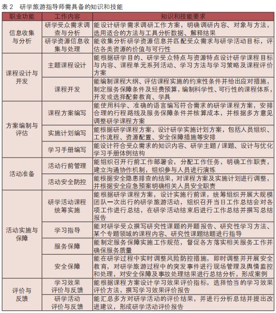 该职业从业人员需具备的知识和技能有:信息收集与分析、课程设计与开发、方案编写与评估、活动准备与检查、活动实施与保障、研学评价与反馈(见表2)。