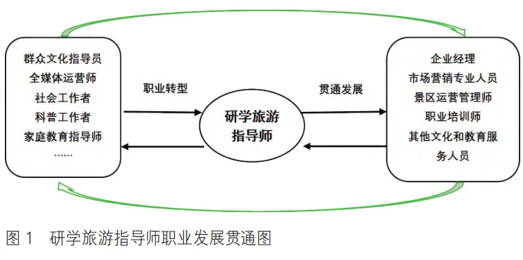 该职业的发展路径主要有四条:一是专家路线,即不断提高技能水平,在职业等级上不断晋升,成为研学旅游指导师专家,甚至在特定研学主题领域成为专家型人才;二是管理路线,即从研学旅游指导师晋升到文化和旅游机构、教育培训机构、各大中型企业的管理层;三是创业路线,即发挥研学旅游指导师在自我知识革新和知识传播技能优势,把握全媒体和数字化时代趋势,进行创新创业;四是复合人才路线,即将研学经验和知识运用到各个行业中,实现职业转型或跨越,为自己的职业发展开辟更广阔的道路。如将研学经验和文化知识运用到文化服务行业中,担任群众文化指导员、全媒体运营师等职位,通过文化主题研学旅游为读者、观众提供更加深入、有趣的文化体验;将研学经验和社会知识运用到社会工作中,通过社会服务主题的研学旅游策划、营销或执行岗位,为社会提供更加实践性、有意义的服务。研学旅游指导师的职业贯通发展如图1所示。