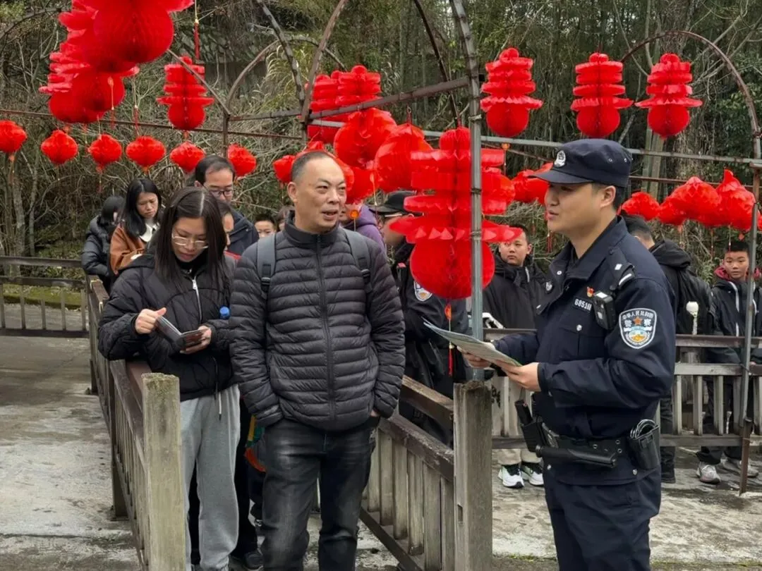 春节假期开始前,民警们便开始提前巡逻,穿梭在青山碧水间,成为金饶山景区一道独特的风景线。在游客集散区,民警主动上前为游客提供帮助,耐心解答路线咨询、讲解爬山游玩安全注意事项,及时疏导人流避免拥挤踩踏,全力保障游客出行安全。同时,民警还结合景区特点,向景区工作人员和商户宣传消防安全、防盗防骗等知识,督促其落实安全主体责任,共同筑牢景区安全防线。