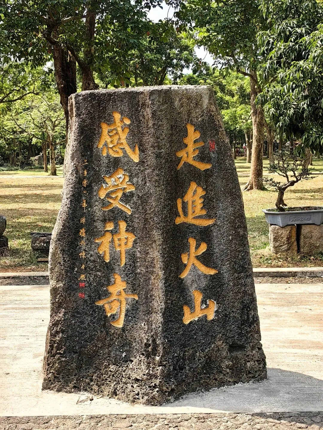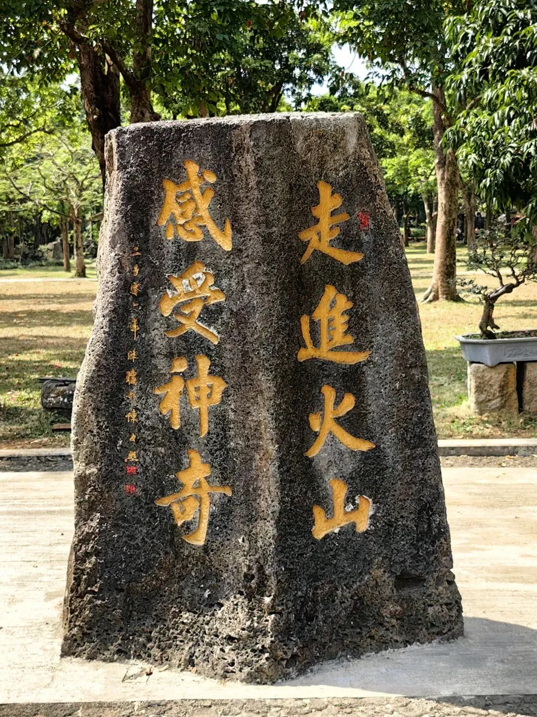 火山石(玄武岩)硬度很高,如铁如钢,远古的人们用这些石头建造自己的家园。如房子,石桌,石凳等。走进公园,发现这里的一切似乎都与火山石有关。人们走的路,雕塑,小池塘……
