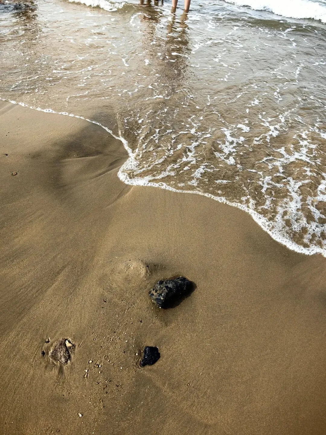 海滩上,有细密的沙子,竟然也有很多火山石,或大或小,被海水冲刷着。难道海底也曾有过火山喷发?真是神奇啊!我捡了两块,留作纪念。