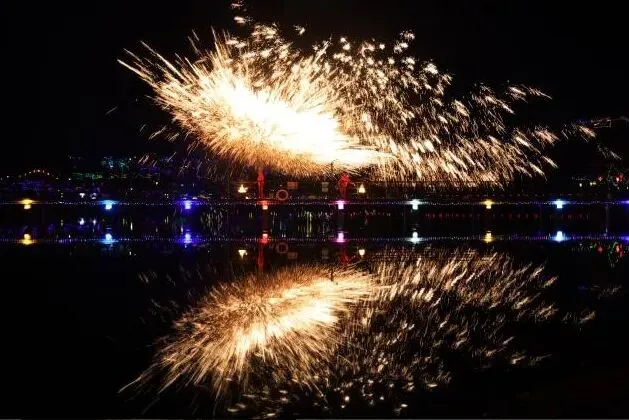 2026年2月19日,安徽省亳州市蒙城县双锁山景区,民间艺人在为游人进行“打铁花”表演。(胡卫国 摄)