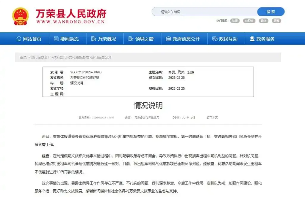 山西运城万荣县文旅局就出租车
