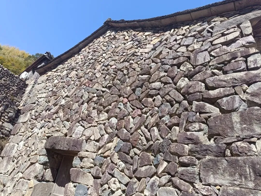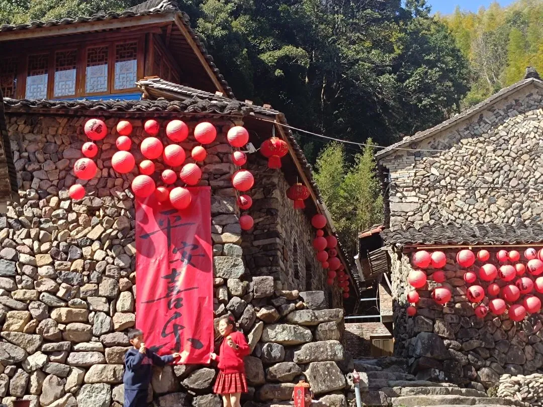 不知道浙江或者全国有没有其他地方也有类似的土木结构的房子。宋氏家族迁过来以后,就地取材,用山泥和石子夯筑土墙,依山势向上延伸,构筑阶梯式民居,形成200米落差的18幢清代民居群。按说,从建筑结构讲,本很普通;从建筑装饰讲,没有雕梁画栋,飞檐翘壁,也是朴素至极。但也许正是这种最朴素的恢宏,吸引了无数游客前来探访。 岩下石头村,名副其实,墙体多以石头为主,堆筑实在是一个极高超的手艺。不同颜色又不规则的石头经过精心布置,形成了不可复制的纹理,特别而看。墙体厚实,想来还是冬暖夏凉,再加上是在山里,想来住着极为舒适。而无处不在的红灯笼和大幅写着喜庆词语的红布,让本来安静的山村显出了勃勃生机。