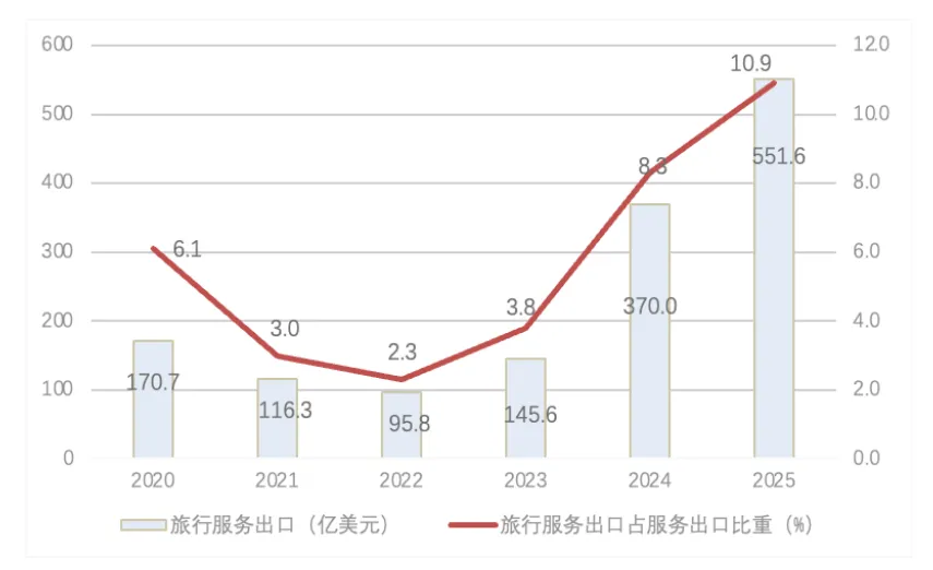 资料来源:联合国旅游组织。 第三,中国是世界最大旅游客源地,贡献全球14.4%的国际旅游支出。2023年以来,中国已恢复了全球最大境外旅游消费国地位。根据中国旅游研究院数据,2024年中国公民出境旅游市场达到1.46亿人次,到访了超过210个国家或地区;其中,超过百万人次的出境国家或地区接近20个,超过10万人次的出境国家或地区超过60个。根据联合国旅游组织数据,2024年中国出境游消费额达到2506亿美元,同比增长28.9%,占全球出境游消费总支出的14.4%,较上一年提升1.8个百分点。 第四,中短途跨境旅游增长较快,文体活动成为吸引跨境旅游的重要力量。2025年,俄罗斯公民出境旅游前五大目的地为土耳其、中国、阿联酋、埃及、泰国,五国合计占俄罗斯出境游总人次的78.1%;中国内地公民出境旅游目的地中,选择中国港澳地区的比例最高,其次为东南亚区域和日韩为主的东北亚地区,马来西亚、印度尼西亚、越南等东南亚国家成为中国短途出境游的重要增长点。近年来,全球各大文体赛事的举办,促使更多人为亲赴国际大型活动现场而旅行。2025年,中东地区在多哈世界乒乓球锦标赛的推动下,国际旅客数量创下疫情后新高、同比增长3%,较2019年增长39%;马来西亚举办多场大型演唱会,该国旅游吸引力明显提升,赴马中国旅客数量增至500万人次,2026年有望突破700万人次。 当前,全球旅游产业迎来技术与文化驱动的深度变革,各国持续完善支持政策,优化产品和服务供给,以便更好满足日益多元化的旅游消费需求,推动全球旅游产业迈向业态创新、数字赋能、绿色转型、自由便利的新发展阶段。 近年来,为满足Z世代、亲子家庭、银发族、商务人士等典型消费群体的多样化旅游需求,各国加快创新旅游产品、培育旅游新业态,全球旅游呈现散客化、个性化和年轻化趋势。例如,日本着力强化会奖旅游(MICE),促进日本成为更多国际会议和奖励旅游团队的活动举行地,成为亚洲会议中心,建立优质MICE服务和配套的国际形象;印度推出“印度治愈”计划,打造全球医疗和健康旅游中心,通过完善医疗基础设施、建立多语言门户网站、创建在线医疗资料库等促进入境医疗旅游发展;韩国推出一系列“K—文化”旅游项目,如韩剧拍摄地游、偶像餐厅打卡、K—美妆体验、K—婚纱摄影等,通过这些独特的旅游体验吸引更多海外自由行游客。 各国紧密围绕游客需求,通过实现旅游资源的数字化、旅游服务的智能化与便捷化、旅游管理的精细化,改善游客旅游体验。例如,美国旧金山积极与中国旅游科技企业对接,针对中国游客定制景区电子地图、数字支付、无人驾驶出租车体验等技术工具,以数字化手段加强对中国游客的吸引。再如中国持续优化支付、出行、住宿等领域数字化服务,提升外国人员入境游便利性。携程海外平台上线多语种入境旅游指南,为境外用户提供涵盖公共交通、通讯上网、酒店预订等全方位入境指引;在多个知名景点设置国际版售票机,支持多语种界面和多种国际支付方式,利用数字化手段为外国人员来华旅游提供便利。北京市文化和旅游局数据显示,截至2026年1月,仅北京就有约1.8万家重点商户实现外卡受理全覆盖,1.14万台ATM机支持外卡取现,“外卡内绑”覆盖7大主流卡组织,“外包内用”银联网络联通37国200余款钱包,地铁实现全时段、全闸口外卡拍卡过闸,极大便利外国人在京出行。 一方面,各国政府通过政策引导,支持发展绿色低碳旅游项目。例如,澳大利亚黄金海岸为私人投资开发绿色环保的自然旅游项目提供资金补助,既促进了当地旅游业的发展,也有力保护了自然环境,实现了经济效益与生态效益的双赢。另一方面,各国注重加强公众环保教育,鼓励公众参与可持续旅游实践。以荷兰哥本哈根旅游局推出的环保奖励计划为例,游客在旅行过程中参与捡垃圾、使用公共交通或骑行等环保任务,即可兑换免费午餐、饮料或皮划艇体验等奖励。该举措不仅提升了游客的环保意识,也进一步推动了当地旅游业绿色转型。 目前,全球已有超过60个国家推出“数字游民签证”,“数字游民”数量突破4000万。全球超过14%的出行人口可申请落地签(2008年为6%),可申请电子签的出行人口比例达到18%(2018年为7%)。2025年,韩国面向印度、中国、越南、菲律宾、柬埔寨等国团体游客试行免签入境政策,停留时间最长为15天。肯尼亚对除索马里和利比亚以外的所有非洲国家公民实行免签政策,外国旅客无需申请电子旅行授权即可在肯尼亚停留长达2个月。日本将出入境审查和海关审查的一部分内容进行合并,只要审查没有问题,游客即可通过人脸识别即可顺利通过海关申报,进一步简化了入境通关流程。 在全球旅游业逐步复苏的大背景下,2025年,我国通过一系列签证便利化政策和服务优化措施,入境游实现全方位复苏增长。从热点城市到边境新城,从观光到深度体验,我国以开放姿态与优质供给成为全球游客青睐目的地。 2025年,我国入境旅游市场呈现高开高走态势,入境人次和旅游收入均实现大幅跃升。 一是入境游人次创历史新高。国家移民管理局数据显示,2025年全年外国游客出入境达到8203.5万人次,同比增长 26.4%,高于当年国内出游人次增速超过10个百分点。其中,免签入境外国人达到3008万人次,占入境外国人总数的73.1%,同比大幅增长49.5%,显示出免签政策的显著红利效应。据此推算,2025年,我