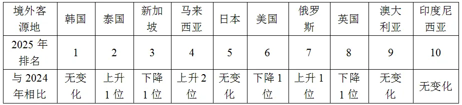 图2 2020-2025年我国旅行服务出口规模及占比 资料来源:商务部。 一是亚洲国家是我国主要的客源地。根据国家统计局数据,亚洲入境游客(不包括港澳台)占我国外国人入境游客比重超过六成(参见国家统计局的2018年统计数据,之后不再更新)。携程海外平台数据也显示,2025 年中国入境游前十大客源地分别为韩国、泰国、新加坡、马来西亚、日本、美国、俄罗斯、英国、澳大利亚和印度尼西亚,其中前五大客源地都是亚洲国家。与上年相比,来自韩国的入境游客数量连续稳居首位;泰国、俄罗斯排名上升一位,马来西亚上升二位。所有入榜客源地均为入境或过境免签国家,显示中国免签及入境便利政策有效促进了境外游客来华旅游。 表2 2025年我国前十外国游客客源地