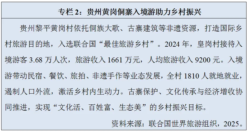 乡村地区凭借原生态的自然环境、独特的民俗文化,以供给适配入境游需求,吸引了大量境外游客,带动乡村民宿、餐饮、文创、农产品销售等业态发展,实现了乡村经济多元化增收。滇桂黔、川西、青藏高原等西部地区,推广“景区带村、村寨联动、线路串珠”模式,重点开发非遗体验、民宿度假、跨境观光等产品。贵州黄岗、浙江余村、安徽西递、广西大寨等 8 个乡村依托联合国最佳旅游乡村品牌,成为国际游客首选目的地。携程数据显示,2025年,来自海外的乡村旅游订单量同比2024年提升了49%。入境游以需求牵引供给,推动乡村路网、通信、供水、环保、医疗等基础设施加快完善,农村硬化路、自来水、卫生厕所覆盖率大幅提高,多语种服务、无障碍设施、智能支付等国际标准服务下沉乡村,积极推动了城乡公共服务的一体化发展。
