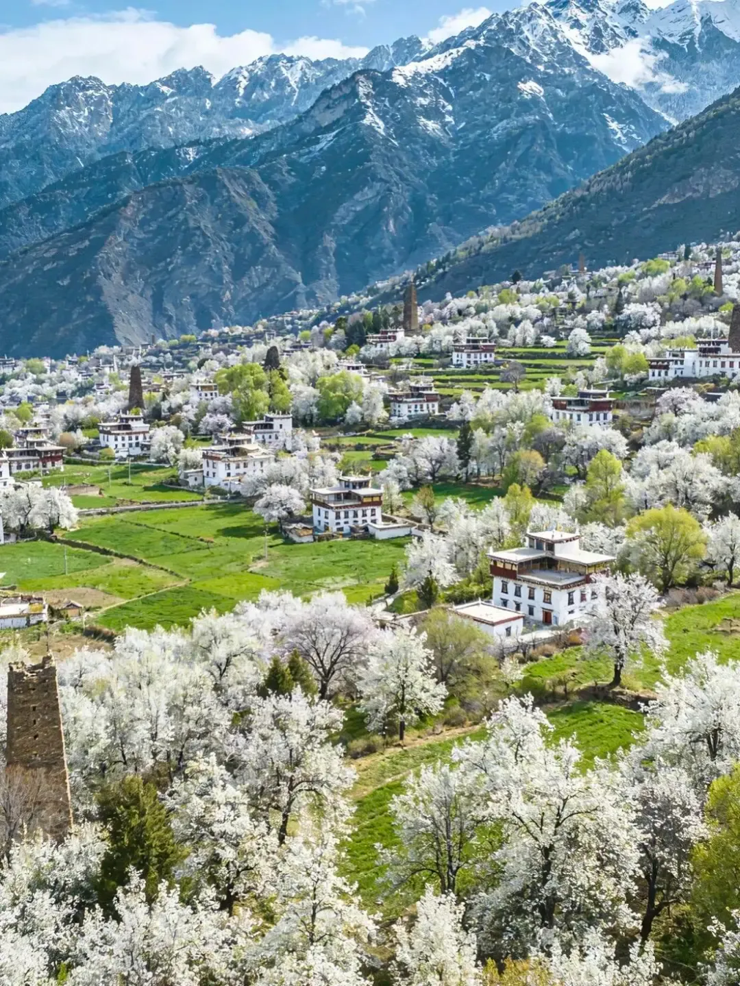 洁白的梨花,褐色的碉楼,绯红的藏寨、远处的雪山,随手一拍都像一幅画。不愧是被国家地理私藏的梨花秘境,来这里赴一场与春天的浪漫约会吧!