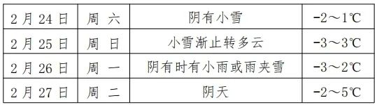 根据最新气象资料分析,预计21-24日我县持续低温雨雪天气,主要降雪时段为22-23日。今天傍晚前后我县逐渐转为雨夹雪或雪,山区可能出现冻雨或冰粒,同时偏北风力4级左右,阵风6~7级。受寒潮天气影响,26日前我县气温普遍较低,最高气温在2℃左右。