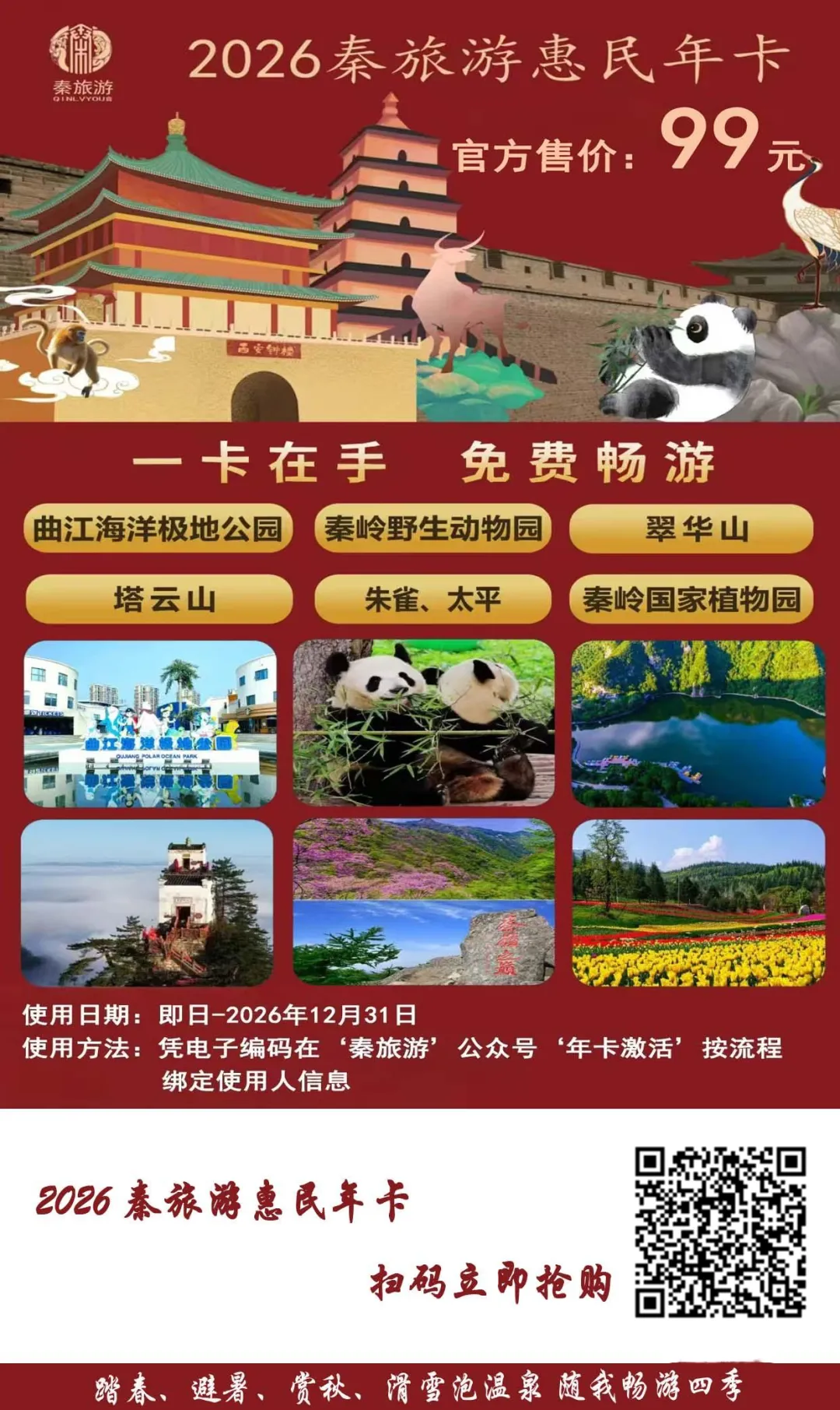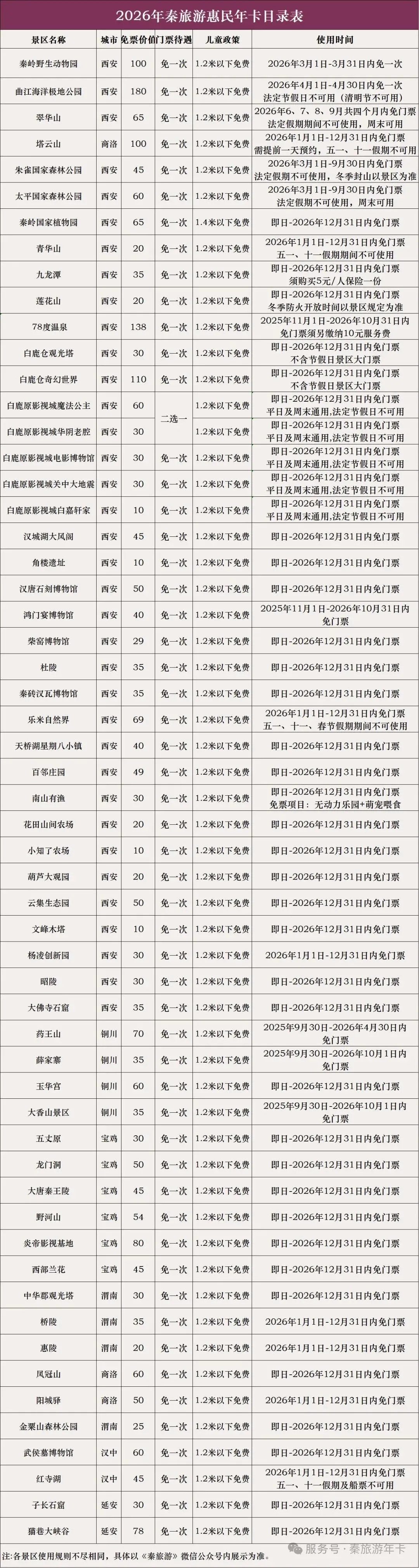 1.本年卡有效期至2026年12月31日,个别景区场馆指定日期使用有效,详情以“秦旅游”公众号内各景区使用规则为准。一人一卡,不可转借。