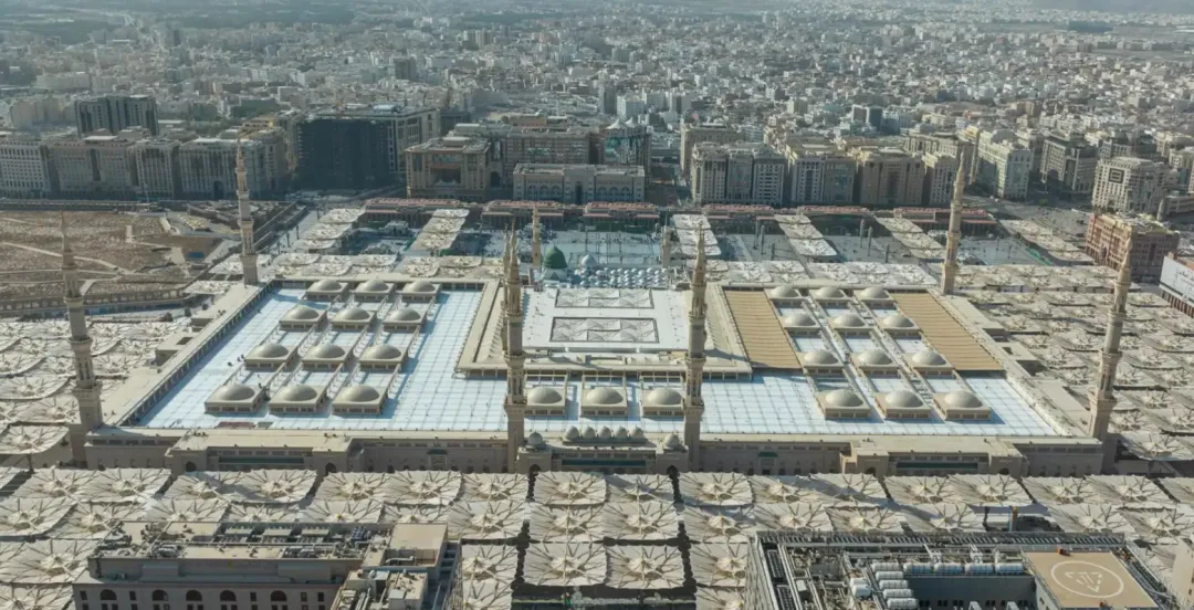(2)许多朝圣者还会前往麦地那的先知清真寺,在先知清真寺祈祷,这为这段神圣旅程画上了深刻的句号。先知清真寺是伊斯兰第二大圣寺,坐落于麦地那核心区,是伊斯兰教史上继库巴清真寺之后第二座清真寺。始建于公元622年,是伊斯兰教创始人、先知穆罕默德亲自参与建造的。哈里发瓦利德一世时期重建,将穆圣与伊斯兰教前两任哈里发阿布和欧麦尔的陵墓合并于先知寺,大体形成了如今的建筑格局。后经多次扩建,先知寺已成为一座庞大的建筑群,成为全世界最大的清真寺之一。