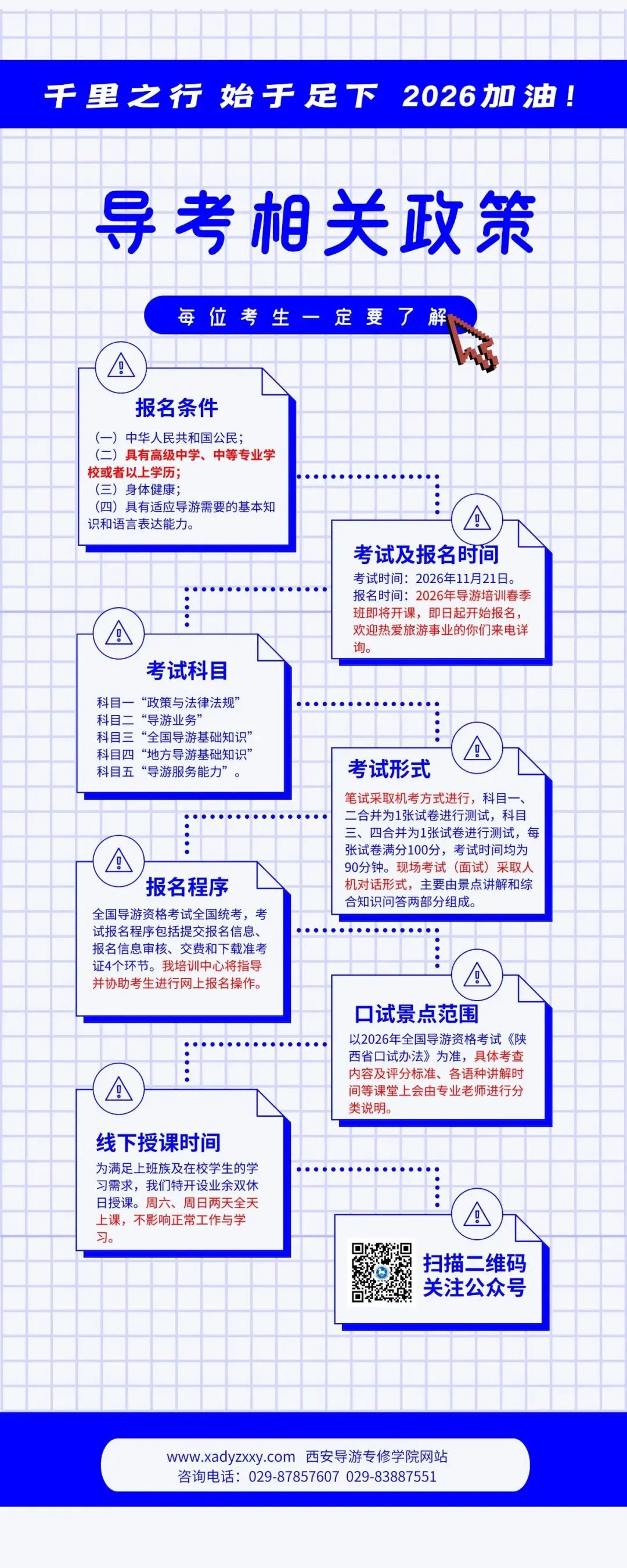 无论你是“零基础”的旅游小白,还是想要提升自我的在职人员,这里都有适合你的班型。2026年导游资格证培训班春季班即将开课,梦想的列车随时可以上车!西安导游专修学院教育培训中心以其“零基础”、“快速学”、“拿证早”的特点,严格的日常管理和人性化的目标教学,助你实现导游梦。
