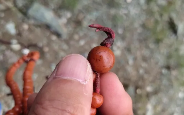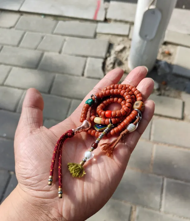 玩友@西北蟑螂,过年去西藏徒步,在半山腰歇脚时,无意中在碎石堆旁捡到一串红色的念珠。