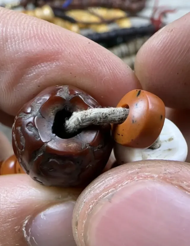 旅游市场常见“仿旧”串儿,绳子最多做旧发灰,很难出现“油浸到发黑、发亮但不贼亮”的感觉。老线绳的黑,不是染上去的黑,而是一点点渗进去的黑。