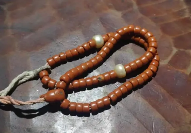 综合玩友@西北蟑螂的描述:“旧线绳的黑油包浆+酥油味+藏式佩戴痕+砖红色珠体”,基本可以将这串佛珠,定位为一串被藏民长期随身带过的曲扎。