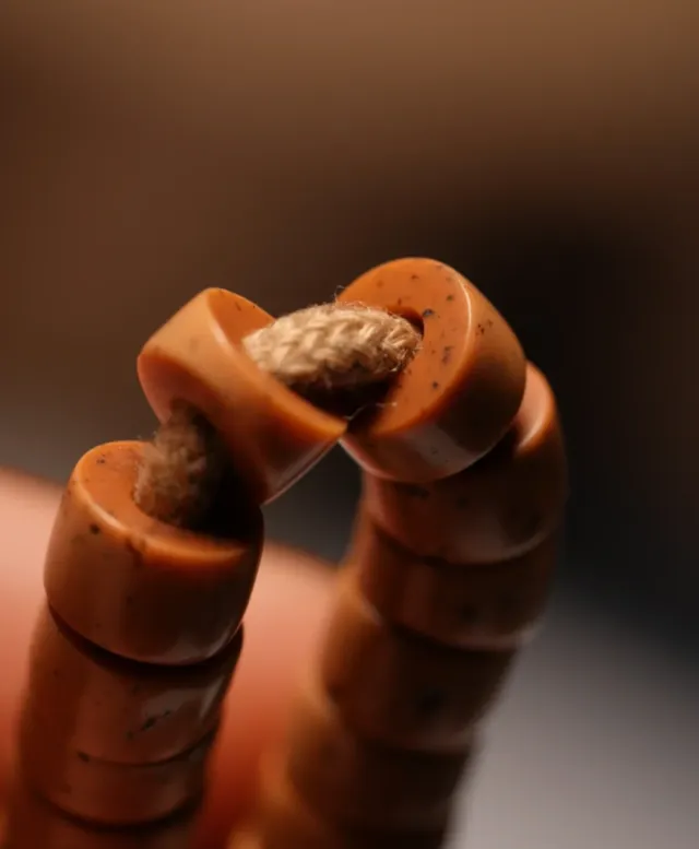特别是常年佩戴的念珠,绳结会被反复拉扯打得紧实扁平,边缘磨耗,你要是打得规规矩矩,打出的线头干净得像刚剪断的,那肯定有猫腻。