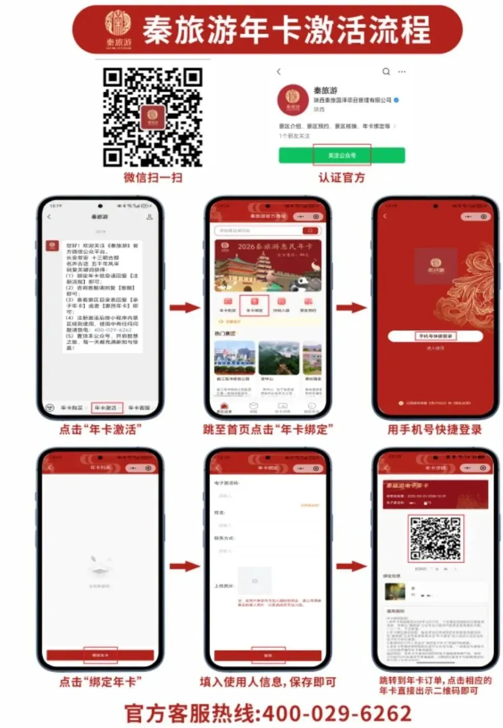 2.年卡绑定激活流程:购买成功后凭收到的手机短信内激活码,在“秦旅游”公众号底部菜单点击“年卡激活”进入实名认证后生成电子年卡即可使用。