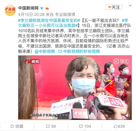 李兰娟:我认为这个五一节正好是我们国家春暖花开的长假,大家应该利用这个节日好好地休息,也可以适当地到人员不是聚集太多的地方去走一走看一看,但还是要避免人群太多的汇聚,关键的还是要做好疫情输入、反弹(防控)的工作,所以我们复工复学复产包括适当的旅游都是可以,但是希望大家目前国际上这么个样子,要旅游在中国还是最安全的。