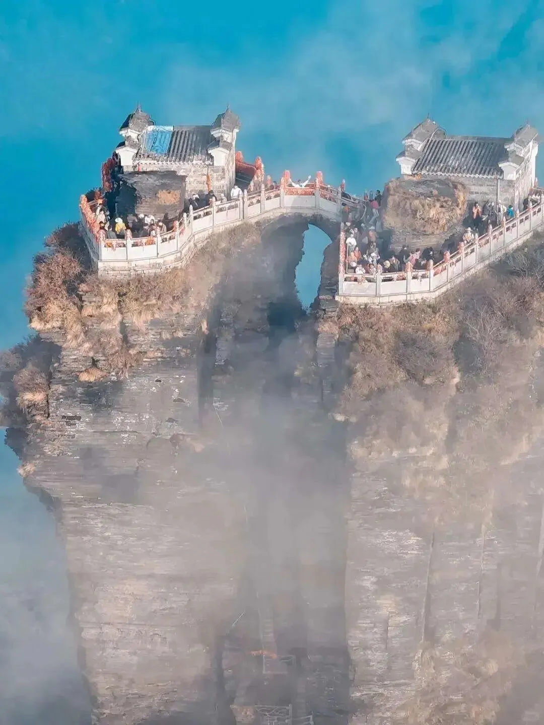 坐.缆.车上.到半山,剩下的路得自己爬。雾气说来就.来,把红.云金顶遮.得只剩个尖。等爬.上老金顶,风把云吹.开个口.子,.脚下.是万米绝壁,.那一瞬间,会.觉得这门.票和.腿酸都值了.。