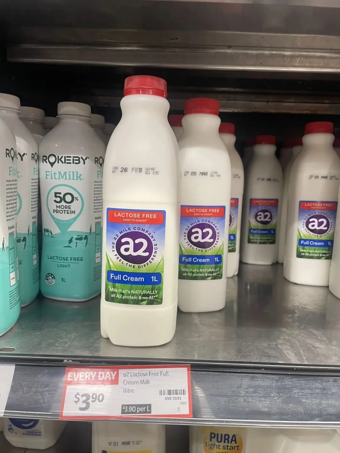 澳洲的鲜牛奶细分得很好,除了脱脂牛奶和全脂牛奶,还有我们这些乳糖不耐受的人喝的牛奶,这样一瓶1L,3.9欧元,20 元不到,便宜又好喝, 我隔天买一瓶,放酒店冰箱里,因为乳糖不耐受,很多年没有喝鲜奶了,这次过了一把瘾。