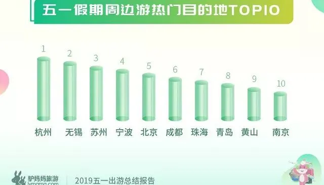 驴妈妈的《2019五一长假出游报告》也显示,周边游依然是最受游客喜爱的出游类型,“1-3天”周边游人次占比超六成。杭州、无锡、苏州、宁波、北京、成都、珠海、青岛、黄山、南京等,位居十大热门目的地。