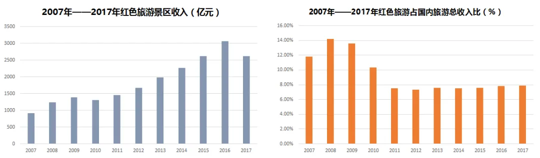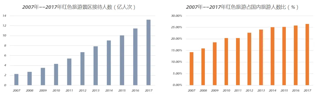 从统计来看,2007年到2017年,全国的红色旅游景区接待的人次从2亿多增长到12亿多,十年时间增长了十倍,发展的非常快。而且可以看出,整个红色旅游占国内旅游人次比已经达到1/4左右。这是一个非常规模宏大的消费、体验产品。