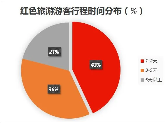 从红色旅游的消费、出游规律来看,周边游、短途游所占比例是比较大的,从这个饼图大家可以看到,两天的旅行过程占43%的。五天以上大概是占21%。红色旅游作为一个公共产品,门票经济,地位我们认为应该逐步下降,而更加强调它的公共产品性,让大家能够更多的机会参与过程。