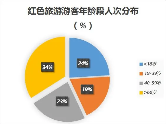 红色旅游游客的年龄层次方面,我们可以发现中老年人市场具有更积极的表现。从上面的饼图上可以看出来,18岁以下的占24%,19到39人占19%左右,40到59均量占23%,60岁以上占34%,如果把40岁以上的人放在一块的话,就已经占到了将近60%左右,所以应该说银发市场、中等收入市场是红色旅游的主要客源市场。
