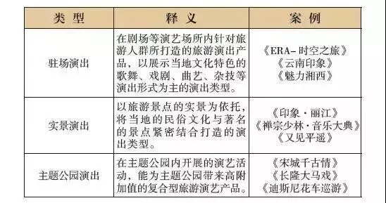 社科院旅游研究中心将旅游演艺定义为为旅游目的地为吸引游客,以多种多样的演出形式,以表现该地区历史文化或民俗风情为主要内容,以异地观众为主要欣赏者的表演、演出活动。