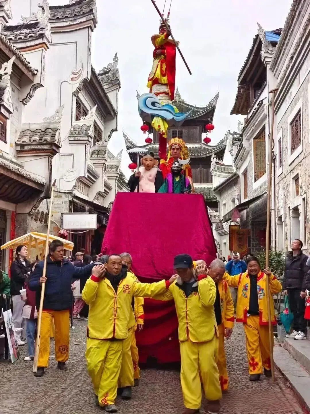 迎故事民俗展演;孩童扮成戏曲人物,立于数米高阁架上,由青壮男子抬游巡城送祝福。
