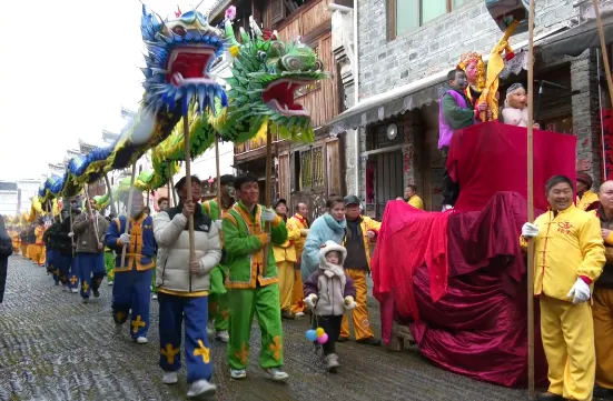 传统民俗,古城接龙活动仪式;东、西、南、北四门派出舞龙队到家家户户送祝福,仪式感满满。