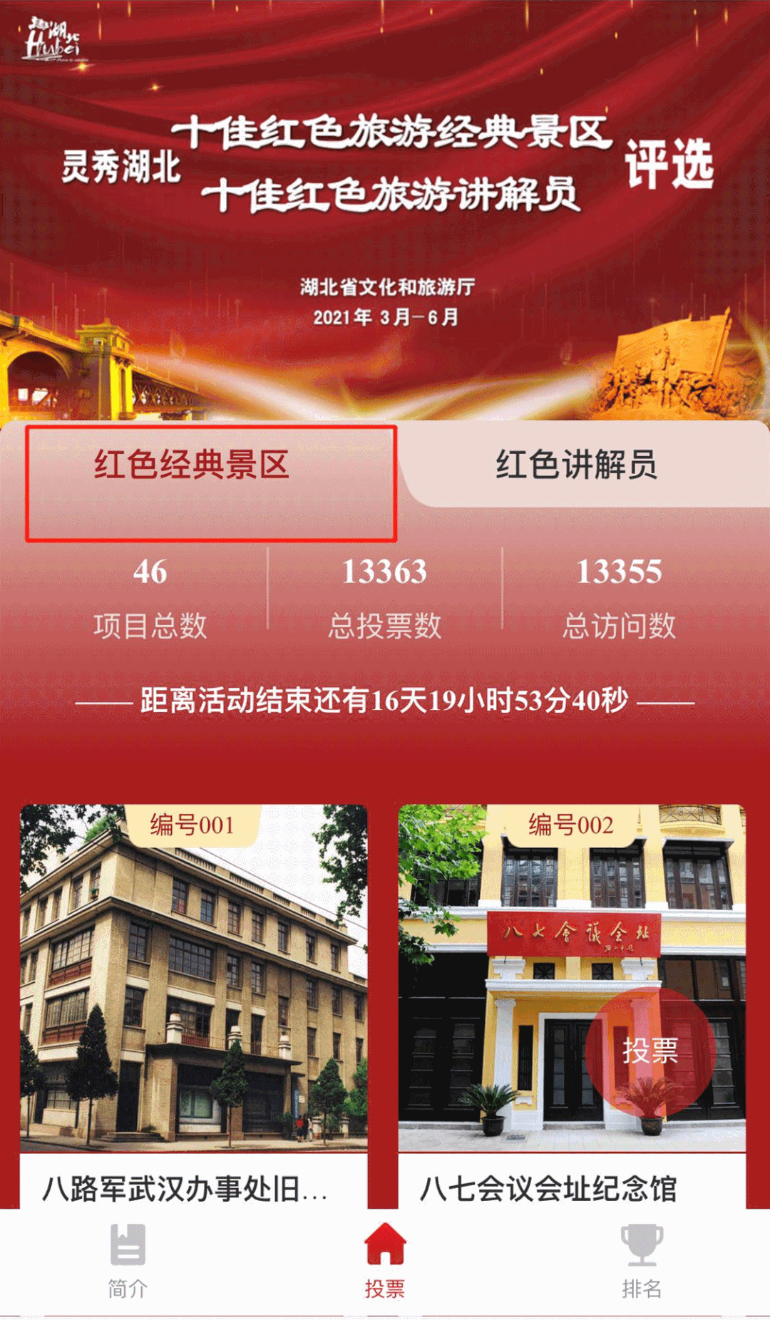 湖北省红色旅游“双十佳”评选开始了!快来为秭归投一票吧~3月19日15时 湖北省红色旅游“双十佳”评选活动 网络投票通道开启啦! 快来为咱们秭归的红色旅游景区 和红色旅游讲解员投票打call吧 为迎接建党100周年,打造“灵秀湖北”红色旅游品牌,建设一批红色旅游讲解员队伍,2021年1月底,我省启动红色旅游“双十佳”评选活动(“灵秀湖北·十佳红色旅游经典景区”和“灵秀湖北·十佳红色旅游讲解员”)。活动自启动以来,得到全社会的关注与参与。 目前,各地推荐上报的46个红色旅游经典景区和75个红色旅游讲解员通过了资格审查,3月19日正式以网络投票的形式进行公开展示,并邀请网友参与投票。 3月19日,网络投票通道正式开启,并将持续到4月5日。本次活动采用实名制投票,公众关注“湖北文旅之声、湖北发布”等微信公众号或打开长江云APP,根据提示即可进入投票界面。 秭归参与评选名单 灵秀湖北·十佳红色旅游经典景区: 灵秀湖北·十佳红色旅游讲解员: 就是现在 动动你的手指 为秭归红色景区和优秀讲解员投票吧! (识别上方二维码)